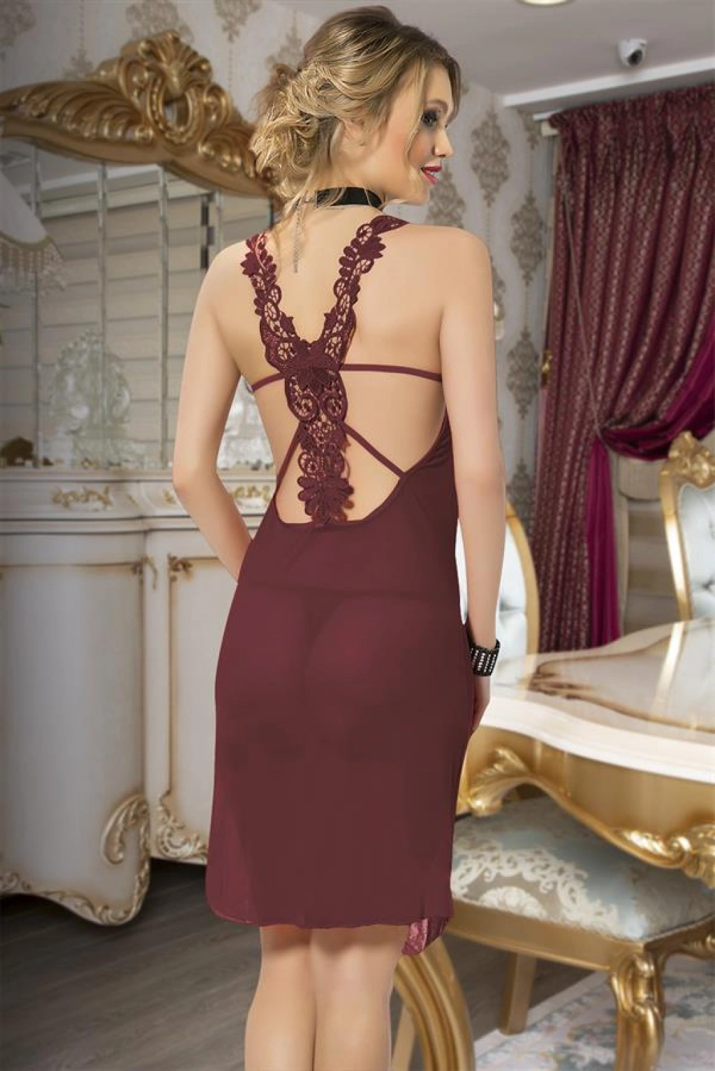 ? Bordo Sırt Kısmı Dantel İşlemeli Fantezi Tül Gecelik ?