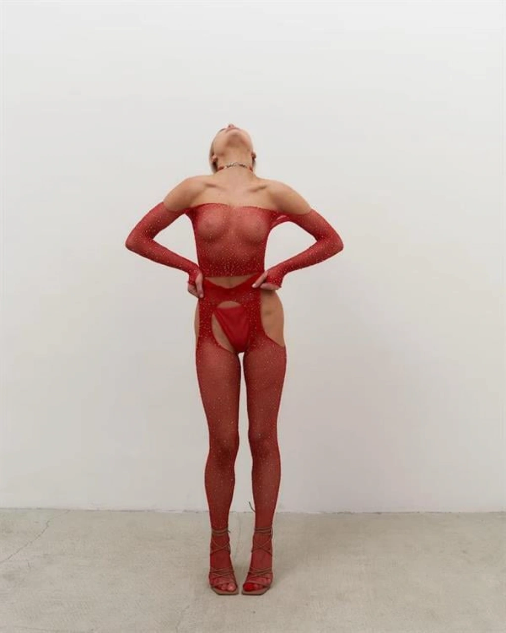 Morliva Özel Tasarım Kırmızı Taşlı Fantezi Vücut Çorabı