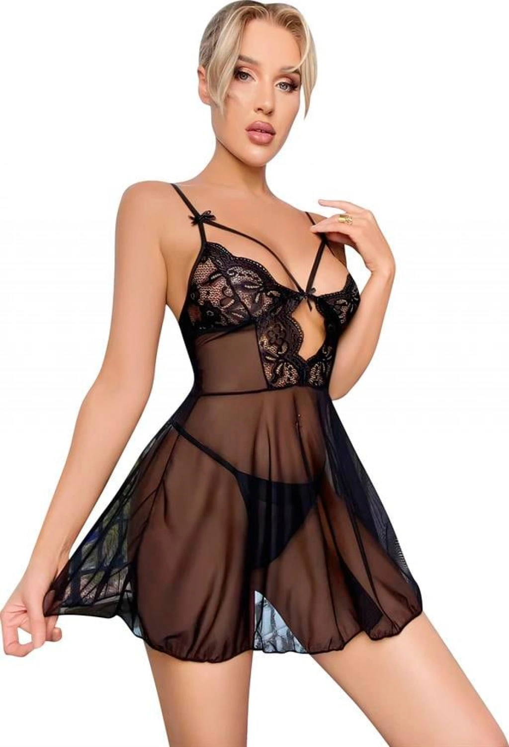 ? Siyah Dantel İşlemeli Göğüs İp Detaylı Fantezi Tül Gecelik Takımı ?