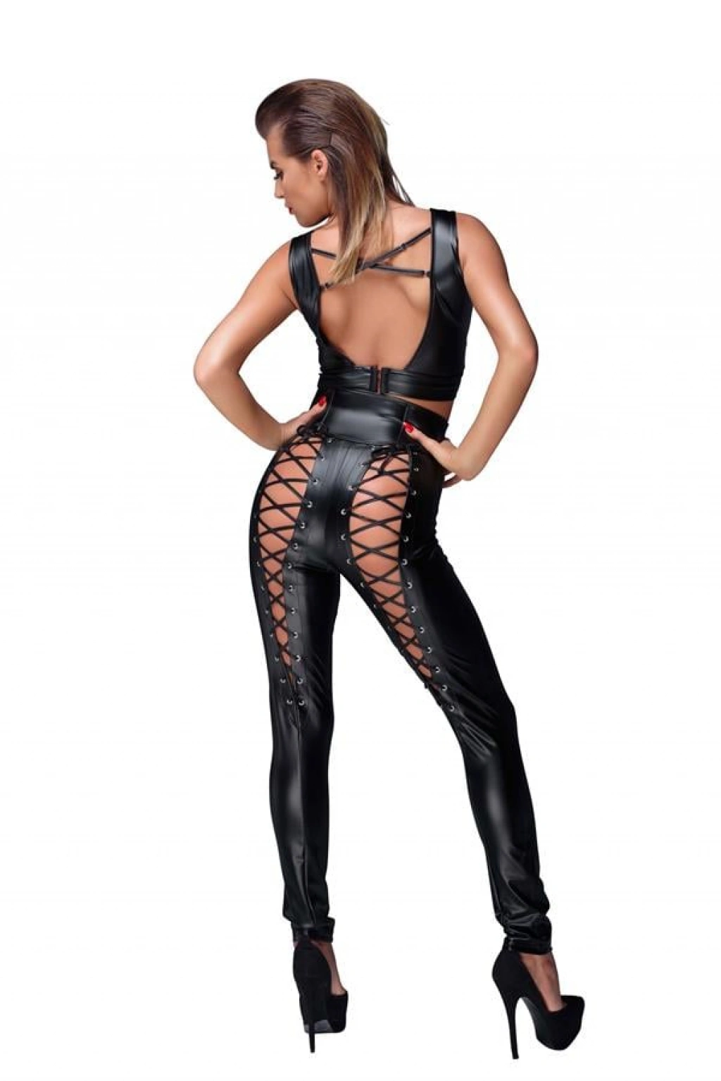 Bu iddialı fantezi tulum, parlak siyah deri görünümüyle vücudu sararak feminen hatları vurgular. Göğüs veya bel bölgesindeki cesur dekoltesiyle sınır tanımayan bir şıklık sunar. Esnek yapısı sayesinde hem rahat hem de etkileyici bir deneyim yaşatır.