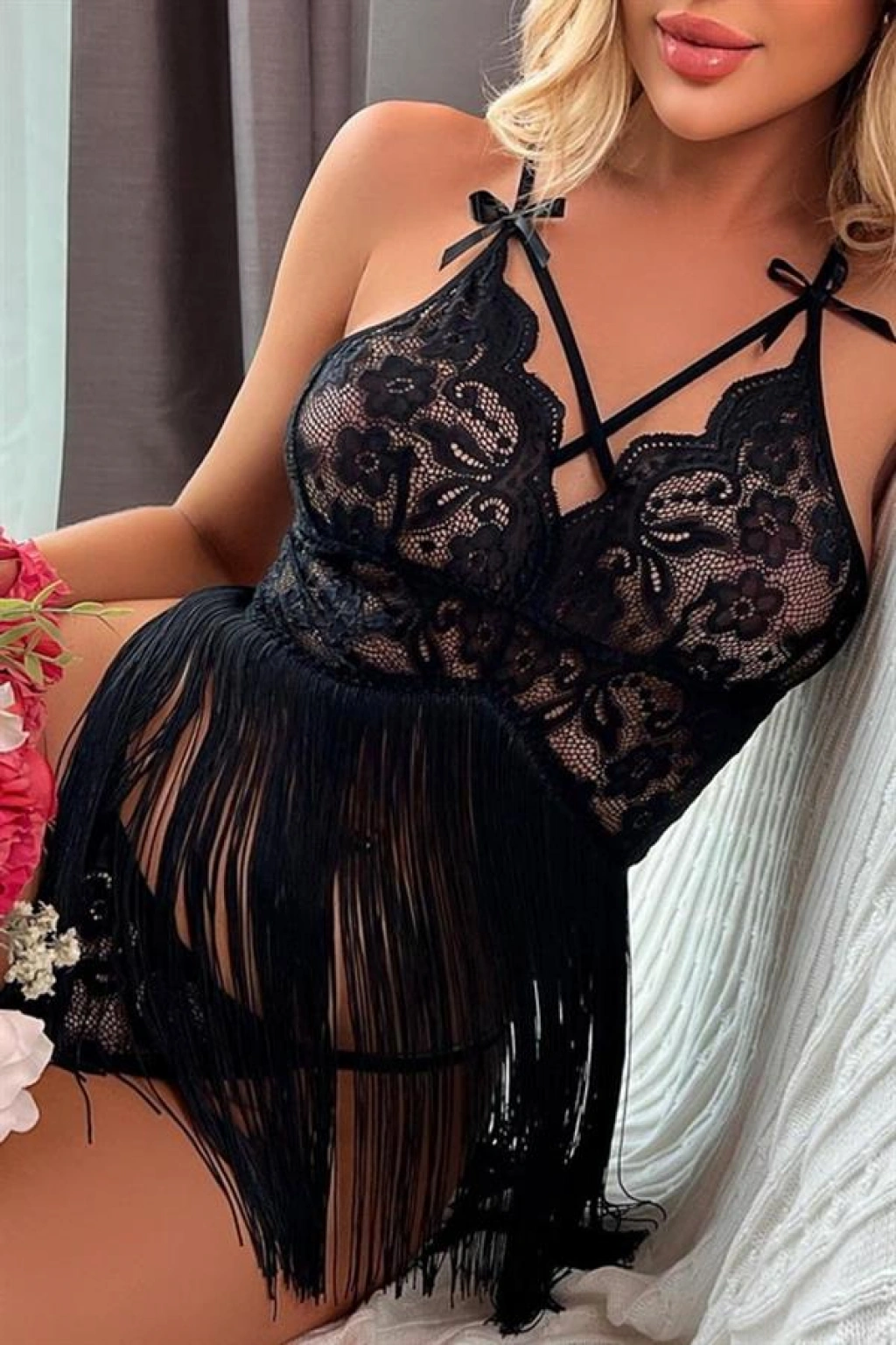 'Aria's Closet Siyah Püsküllü Dantel Detaylı Fantezi Gecelik', şıklığı ve şehveti bir arada sunar. Zarif dantel detayları ve iddialı püskülleriyle göz alıcı bir tasarıma sahiptir. Bu özel parça, gecenize tutkulu bir dokunuş katacak. Yüksek kaliteli ve rahat kumaşıyla gece boyunca konforunuzu sağlarken, kendinizi özel ve çekici hissetmenizi sağlayacak. Aria's Closet'un özgün tasarımıyla, bu siyah geceliğin büyüleyici etkisine kapılacaksınız. Kendinizi özel hissetmek istediğinizde, 'Aria's Closet Siyah Püsküllü Dantel Detaylı Fantezi Gecelik' her zaman bir adım önde olacaktır.