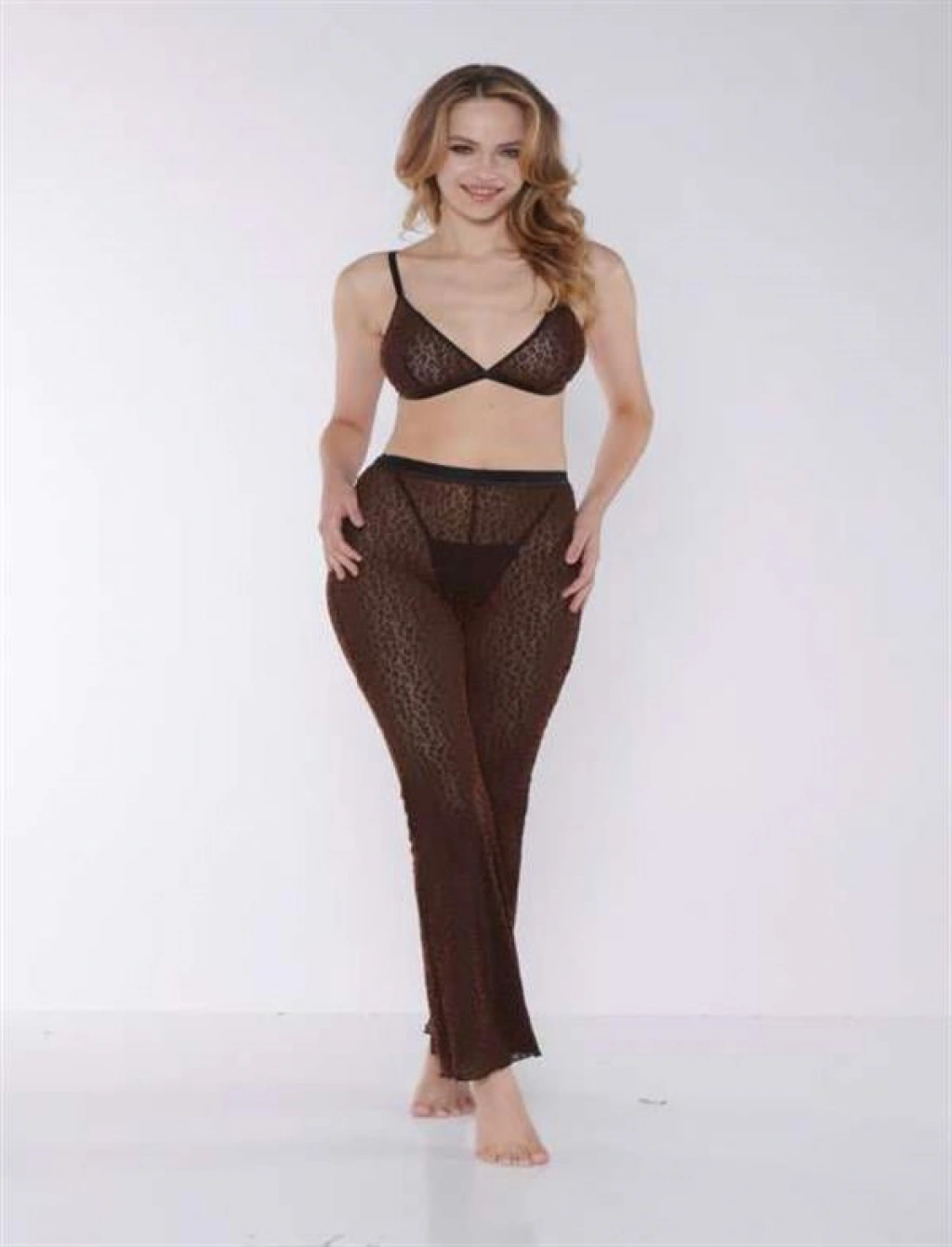 İnce siyah transparan kumaştan tasarlanan bu özel takım, fantezi sütyen ve hafif pijama altıyla hem rahat hem de baştan çıkarıcı bir görünüm sunar. Hafifliği, şıklığı ve feminen dokunuşlarıyla geceni özel kılmak için tasarlandı.