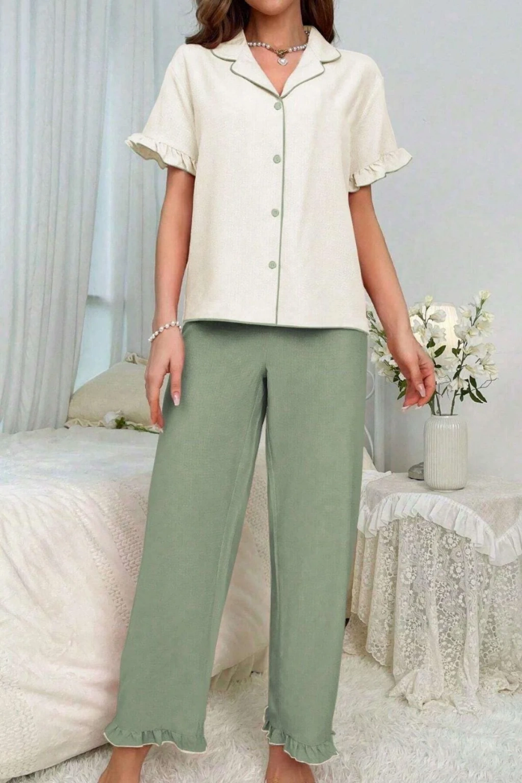 Yeşil Kruvaze Yaka Fırfır Detaylı Pijama Takımı 7023 Bedenler : S-M-L-XL Paket İçeriği : *Pijama *Gömlek Metaryel Bilgisi : %60 Viskon %30 Polyester %10 Lyrca Yıkama Talimatı : Maksimum 30°C'de yıkanır