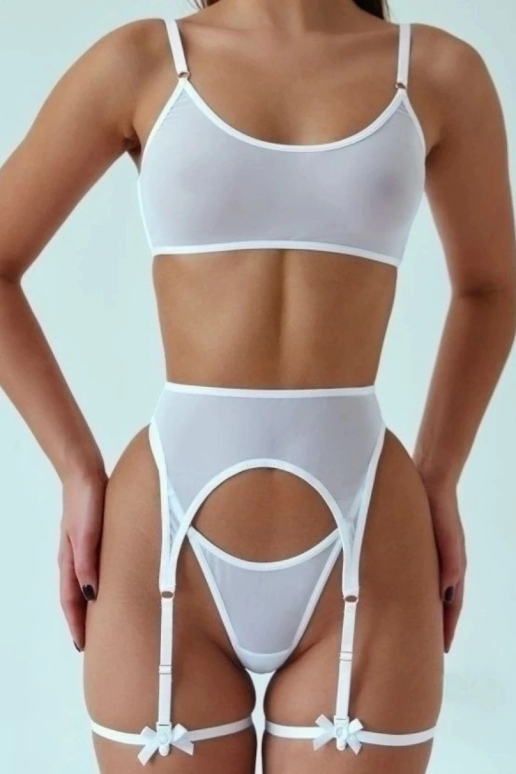 Morliva Beyaz Dantel Bacak Bantlı Jartiyerli Sütyen Külot Takımı