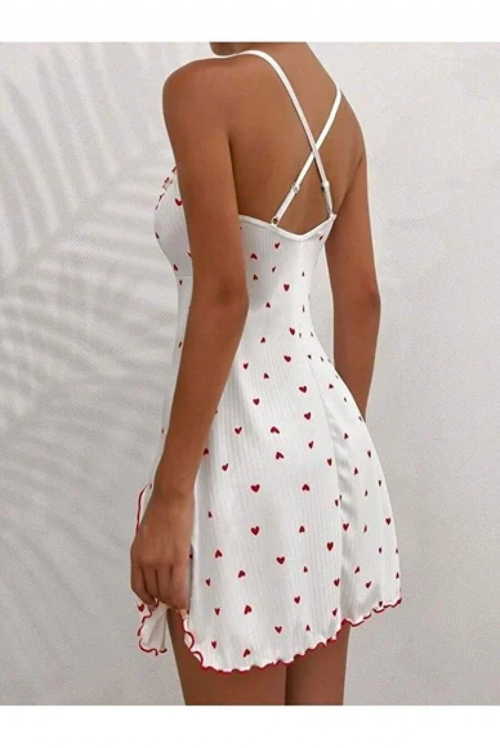 Kadın Beyaz Kırmızı Kalp Desenli Yandan Dantel Detaylı Askılı Elbise 5070