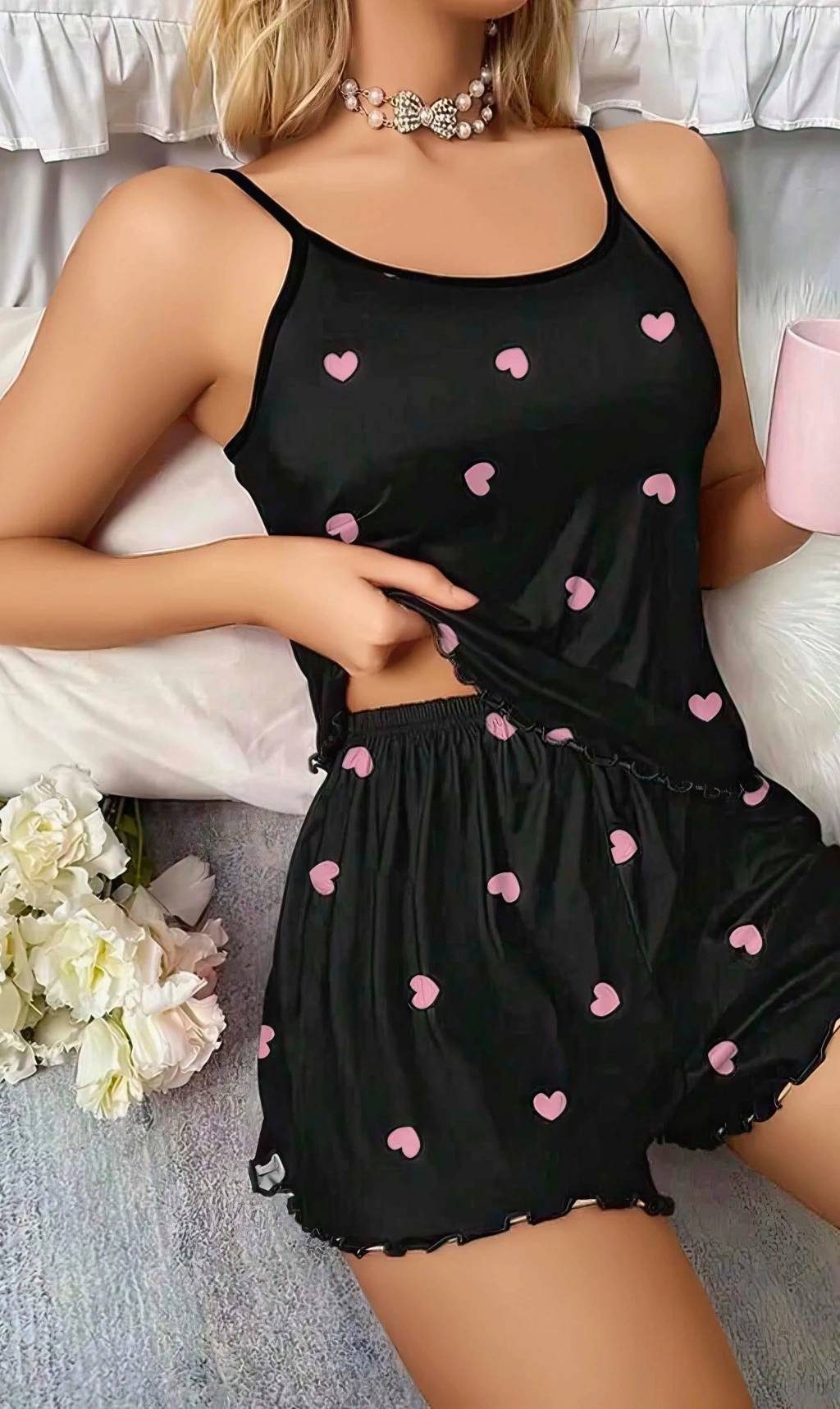 Kadın Siyah Kalp Desenli Askılı Şortlu Pijama Takım 5008