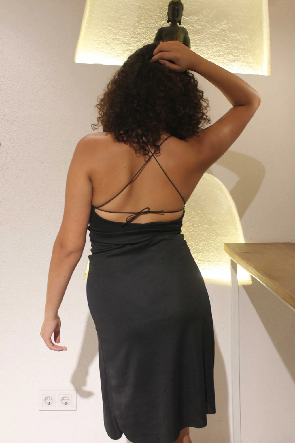 Kadın Siyah Pembe Gül Desenli Askılı Bağlamalı Dantel Detaylı Elbise 5072