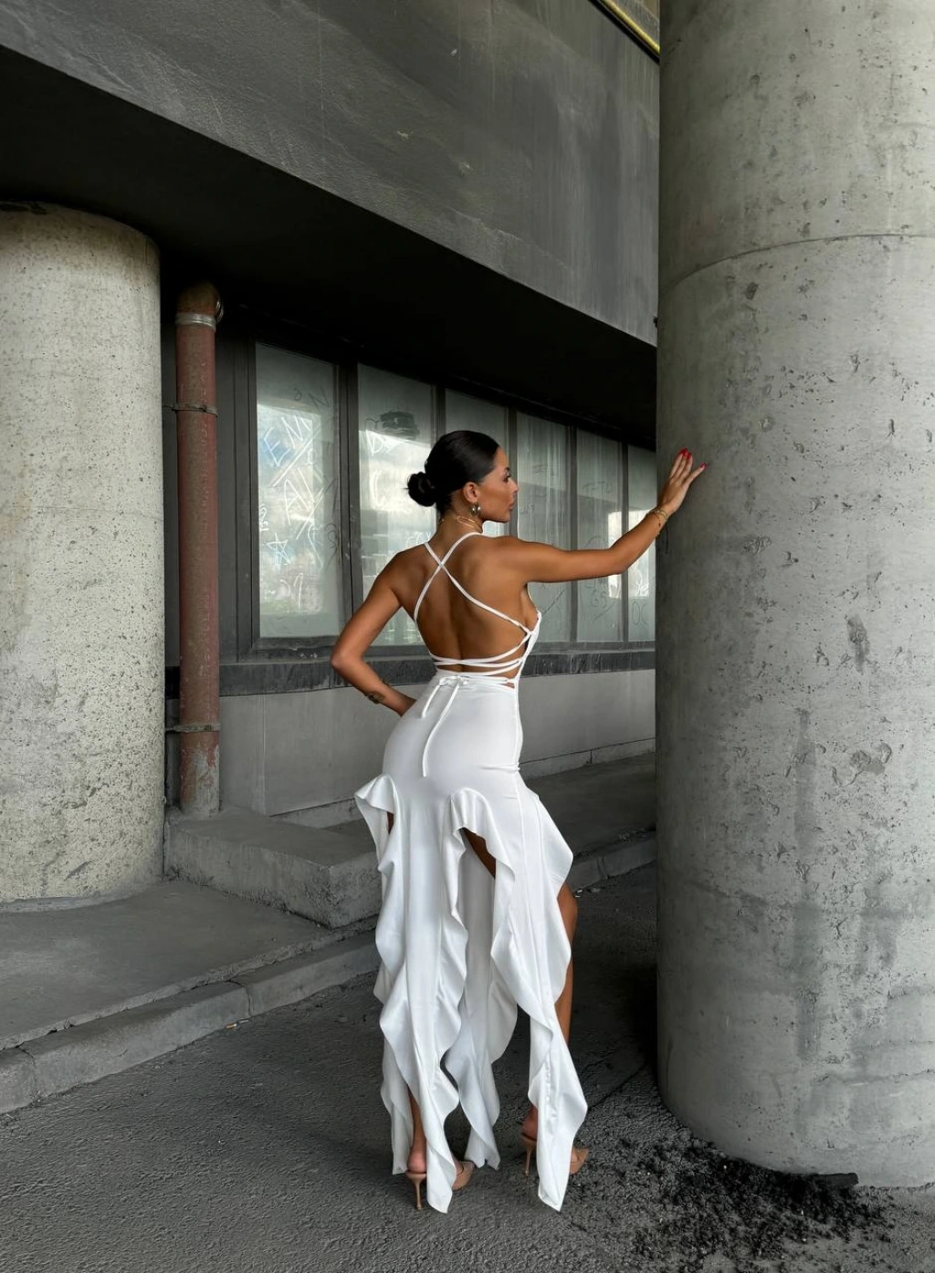 Morliva Sırt dekolte fırfırlı maxi boy elbise