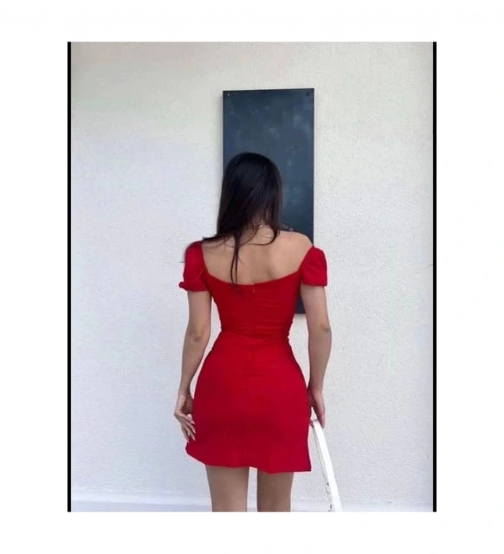 Morliva Kırmızı Dekolteli Yırtmaçlı Elbise