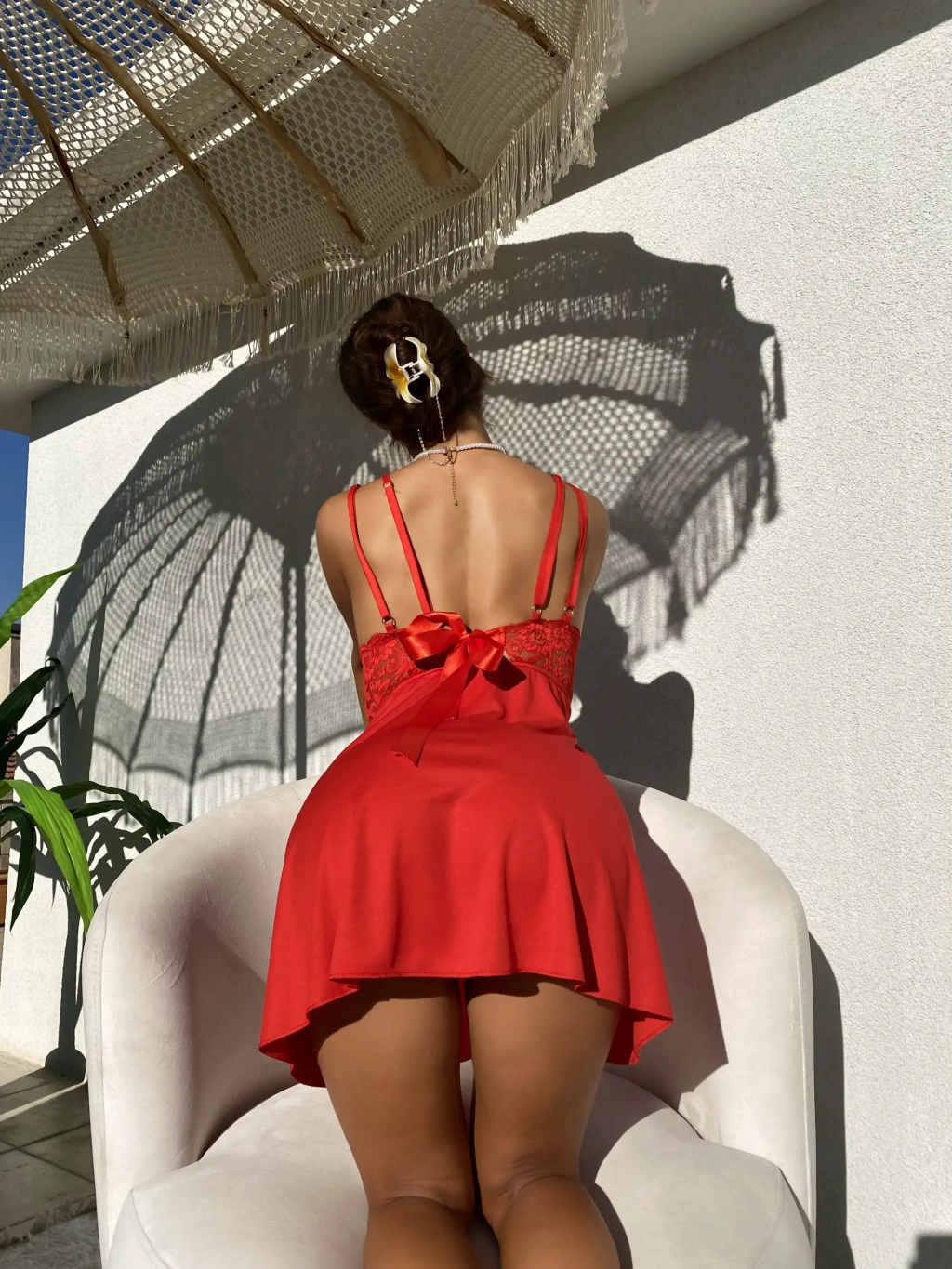 Morliva Kırmızı Dantel İşlemeli Jartiyerli Fantezi Şık Gecelik