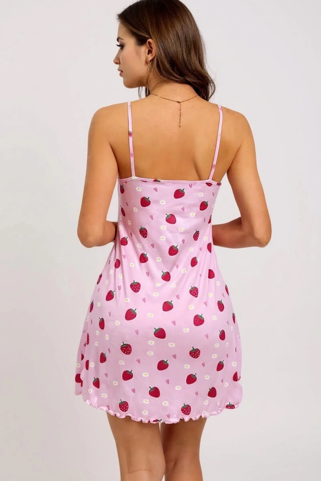 Pembe Çilek Desenli Askılı Kadın Gecelik