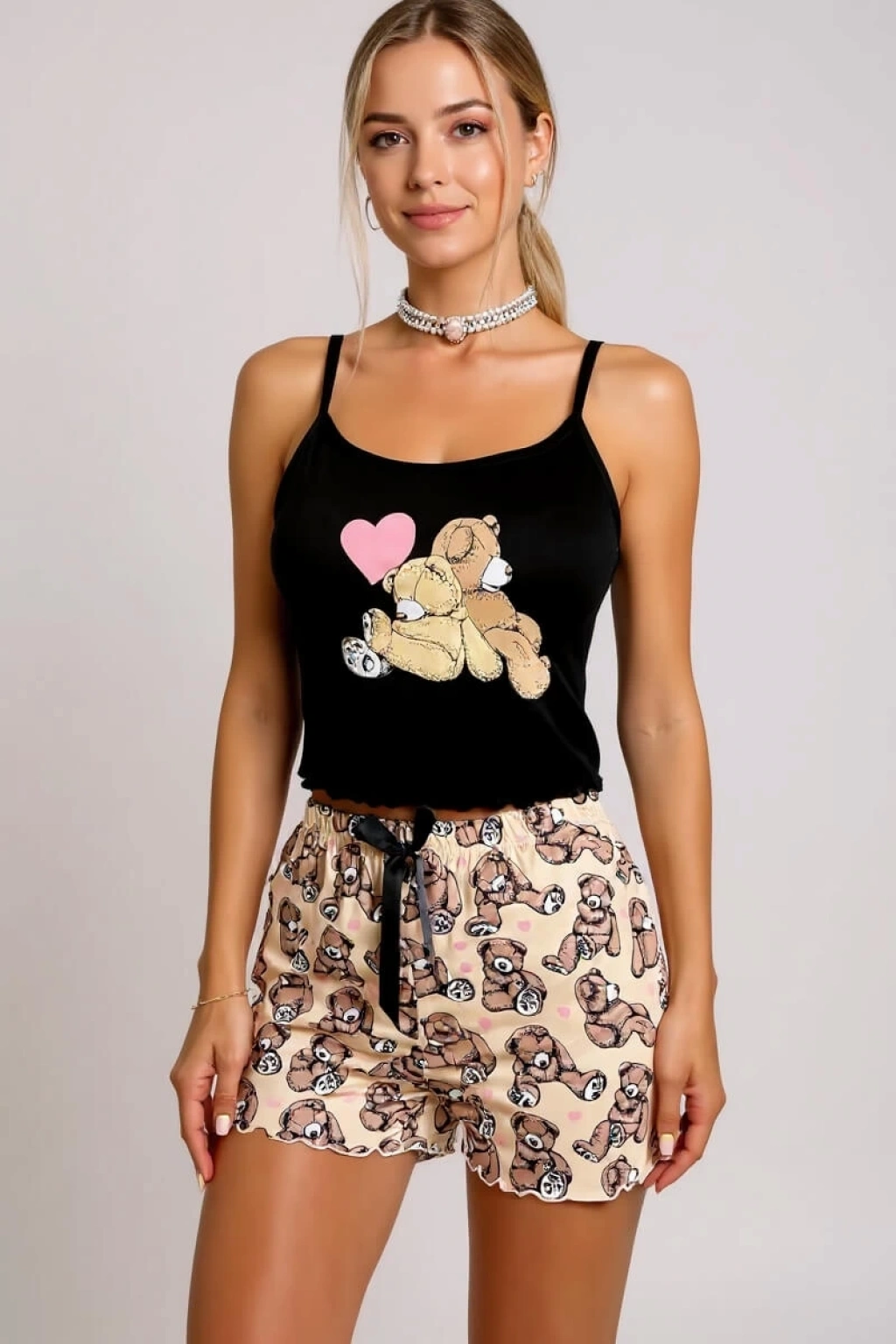 Kalp Desenli Askılı Şortlu Pijama Takımı