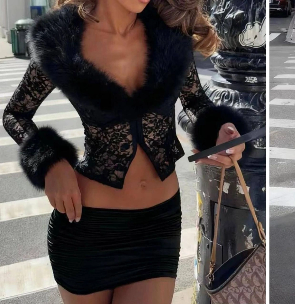 kürk detaylı dantel detaylı kumlu kumaş ikili takım