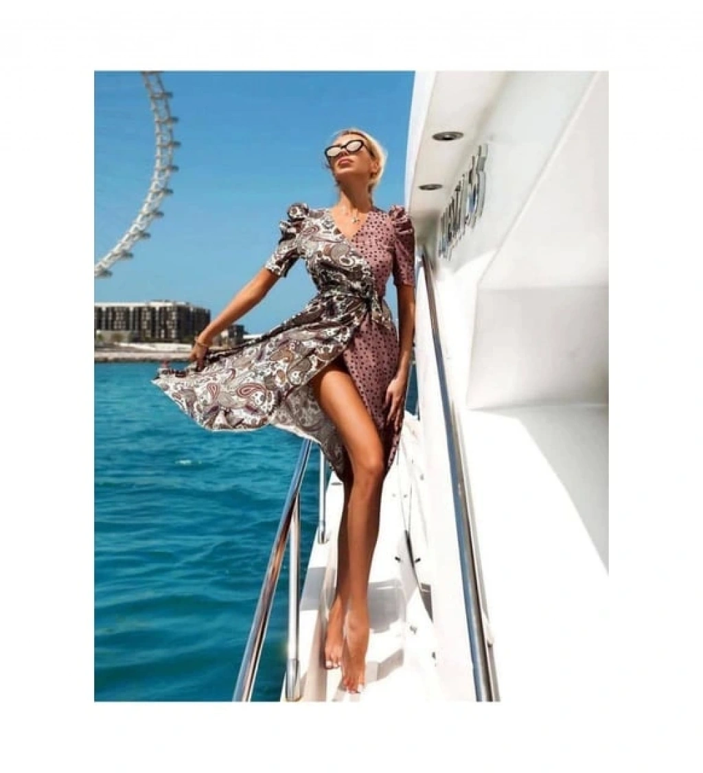 Morliva Micro kumaş desenli yırtmaçlı elbise