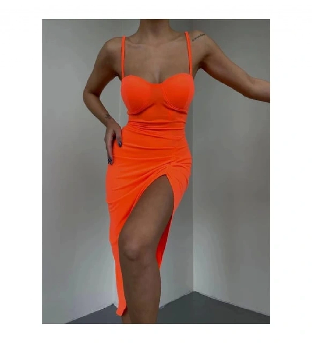İP ASKILI GLOPLU & YIRTMAÇLI TURUNCU MİDİ ELBİSE